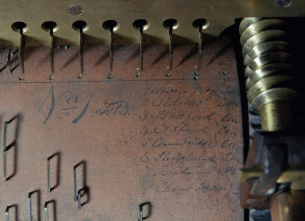 Dumb organist labelled on barrel: ‘T.C. BATES & SON, Organ Builders, 6, LUDGATE HILL, LONDON.’ An old label may have been used, as the organ itself has the nameplate: ‘BATES & SON, Organ Builders, LUDGATE HILL, LONDON’, which was used from 1859 onwards after the death of Theodore C. Bates.Tunes recorded in 1999.One red barrel x 8 tunes labelled ‘No.1’, but there are no others. The tunelist is written on the barrel and initialled T.B. [Theodore Bates]